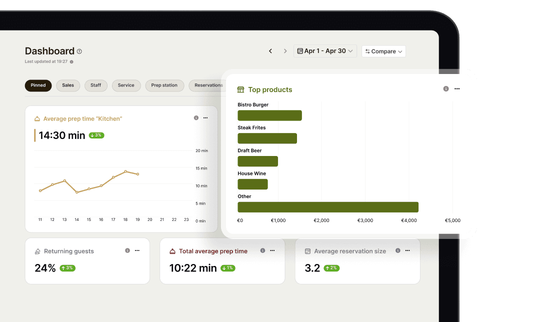 Houd het tempo van je prepstations, wachttijden en bestellingen in de gaten, zodat je tafels sneller kunt bedienen en meer omzet genereert.